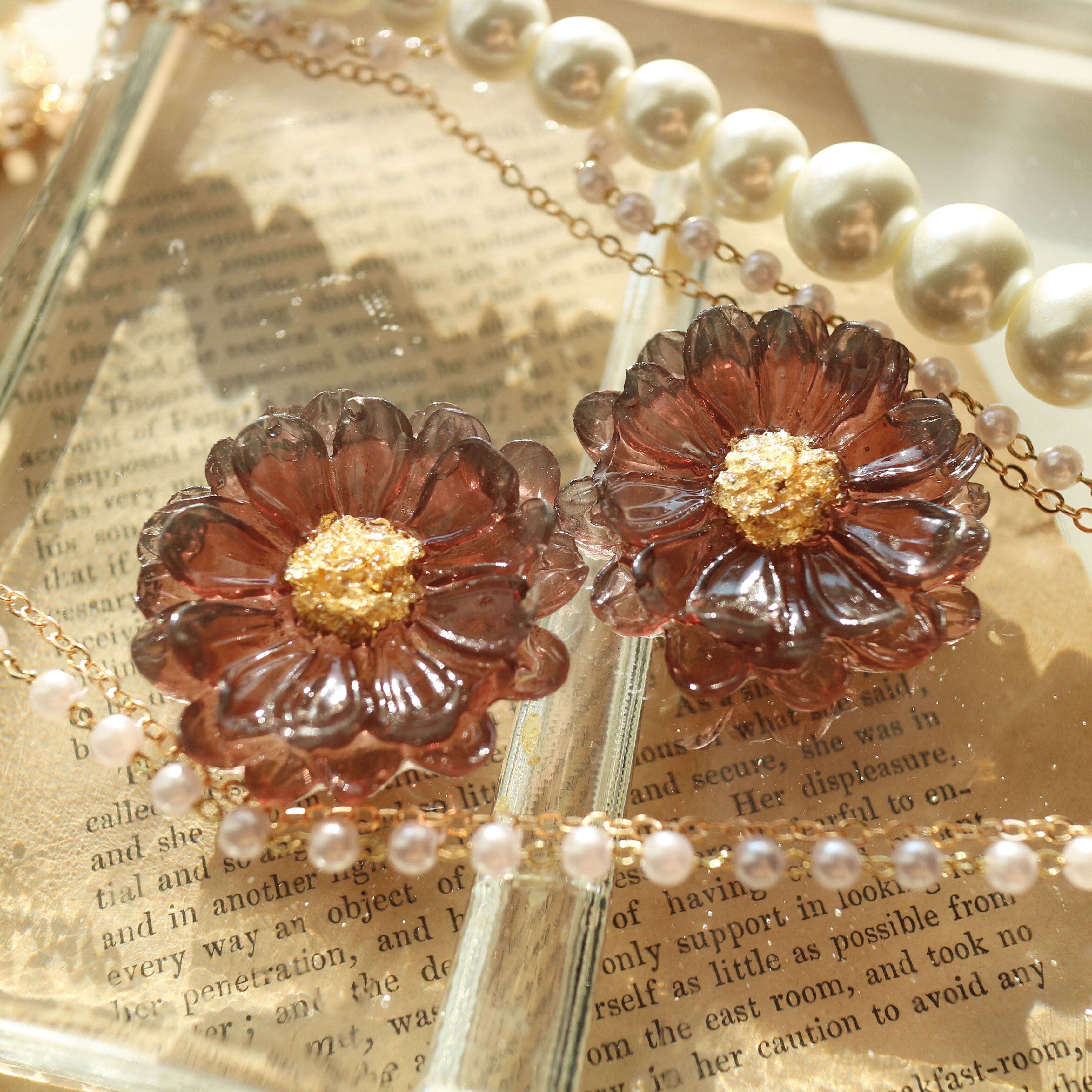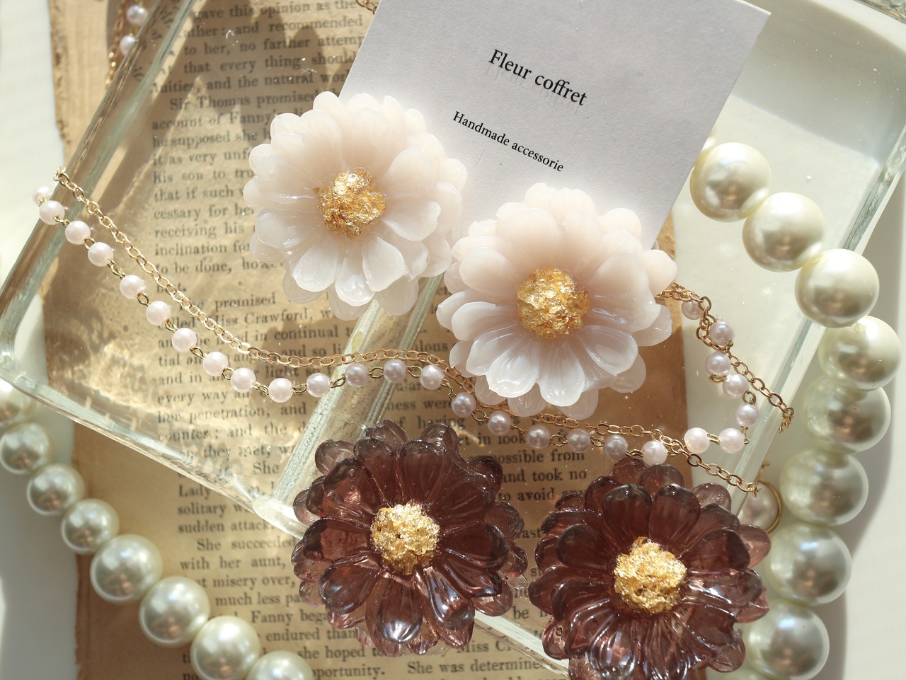 透明感が美しく、立体的な花びらで作っております。大ぶりですが軽いつけ心地です。